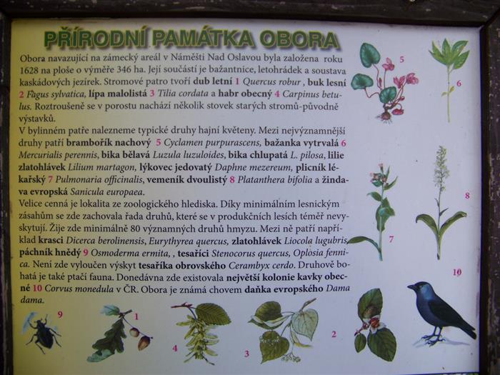 Uvnitř obory byl postaven v roce 1890 zámeček Lusthaus. Ve východní části obory byla v roce 1850 postavena myslivna. Při zdi u silnice k Brnu stojí hájovna.Obora se nalézá ve výši 360 – 480 m nad mořem. Pramení zde čtyři potůčky. Na jednom z nich je postavena kaskáda čtyř rybníčků.V roce 1985 bylo v oboře 310 daňků, kteří se zde chovali již před husitskými válkami. V devadesátých letech byl jejich stav snížen na 187 kusů. Díky minimálním lesnickým zásahům se v oboře nalézá mnoho druhů drobných živočichů. Pozoruhodná je ptačí fauna. Před postavením letiště zde existovala největší kolonie kavky obecné v republice. Stromové patro tvoří převážně listnáče, z nichž je více než polovina dubů. Nedozírné škody v oboře napáchala vichřice v roce 1929. Tehdy padlo několik set stromů s obvodem kmene větším než 600 cm. Dnes jsou zde pouze 3 takové duby. Oboru spravují Lesy České republiky, lovecký revír je pronajatý soukromému subjektu.